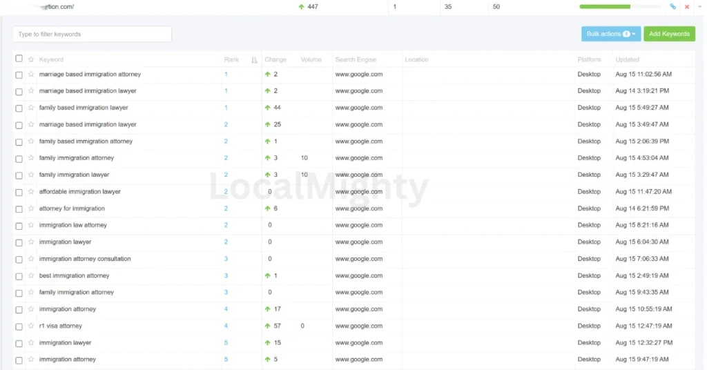 The law office aimed to expand beyond one city and diversify into multiple practice areas. The goals were to rank for high-commercial-intent keywords in immigration, family, and marriage law, boost visibility across Google and AI search platforms, and drive consistent, high-quality traffic. Central to the objective was increasing targeted lead generation, strengthening brand authority, and establishing a trusted online presence for long-term growth.